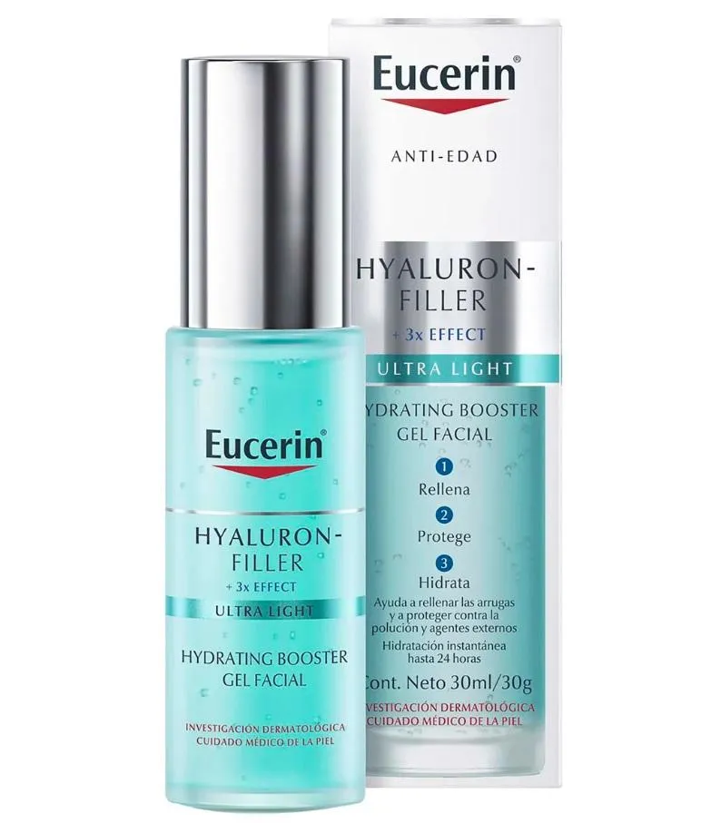 El Hyaluron-Filler 3X Effect Ultra-Light Gel de Eucerin es un tratamiento hidratante y reparador diseñado para piel mixta a grasa. Su fórmula avanzada combina ingredientes que ayudan a rellenar líneas de expresión, hidratar intensamente y fortalecer la piel.